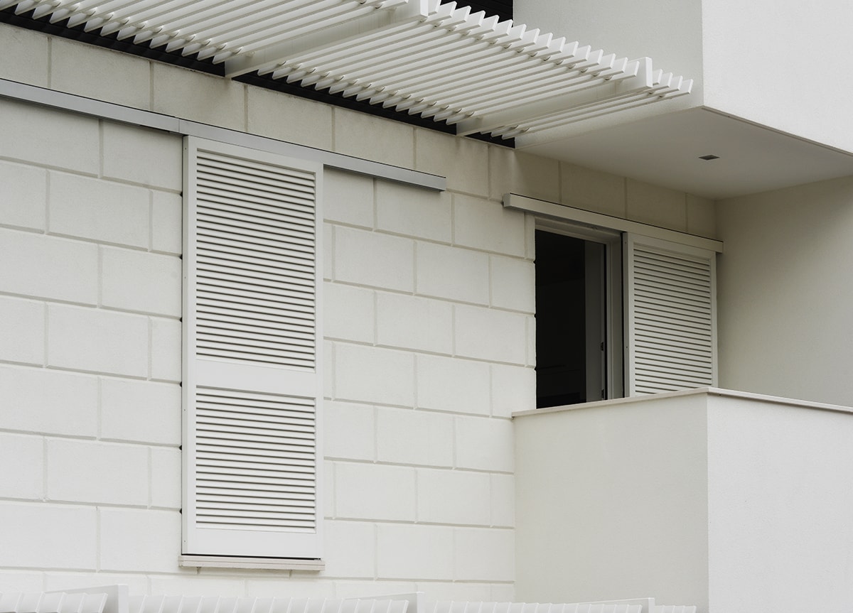 Installazione di persiane in alluminio a battente e scorrevoli con meccanismo esterno. Le persiane sono state installate su lati diversi dello stesso palazzo, con vista su terrazzini e sulla strada.